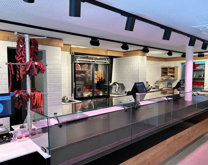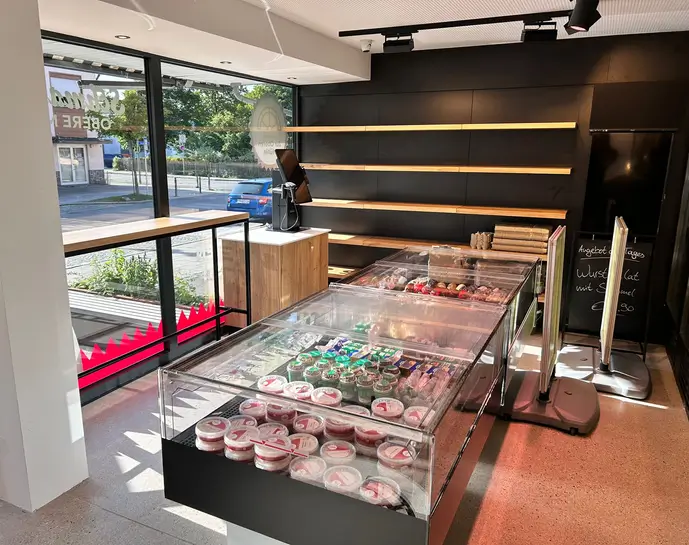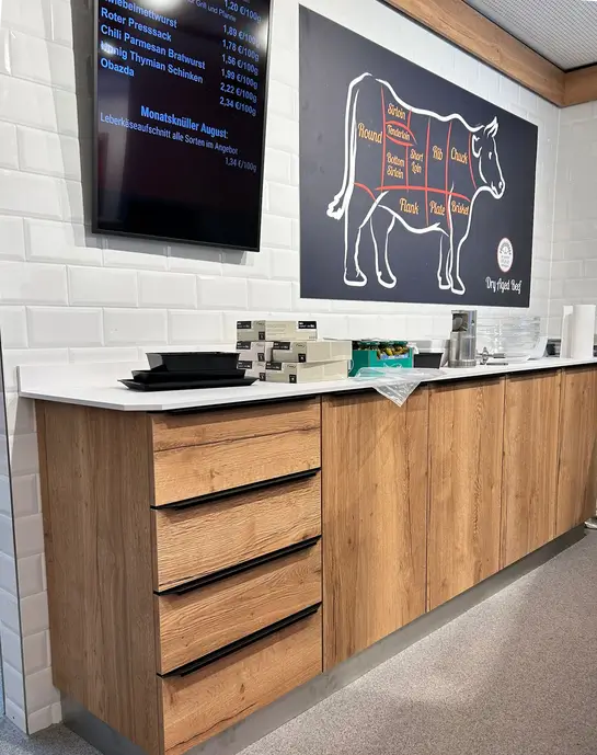 var body = document.body; body.className += " u-body u-clearfix u-xl-mode"; body.style.cssText += " "; var dataBg = ''; if (dataBg) { body.setAttribute('data-bg', dataBg); } Metzgereien, Gastronomie und einzelhandel Ladenbau Metzgerei "Zur oberen Mühle" Regalnischen in Eiche Massiv, Korpus in Eiche beschichtet SB Regal in Schwarz und Eiche, Schwarze Griffleisten, Arbeitsplatte Compact weiß 196